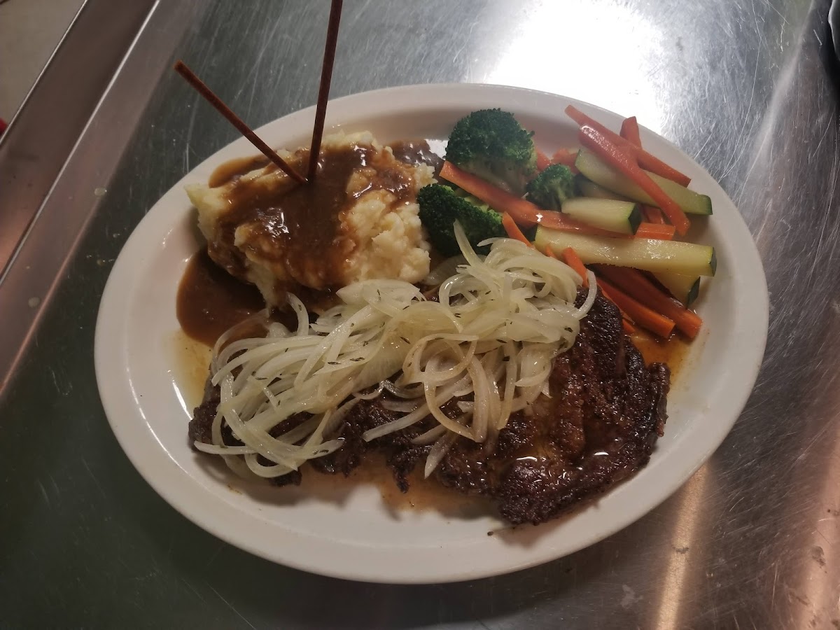 Served with, rice, beans, salad, cactus salad, and mexican cheese, topped with grilled onions